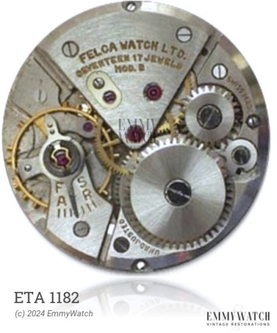 The ETA 1182 is a manual wind mechanical watch movement that was utilized around 1945. It belongs to a series of movements including the 75, 751-759, and 7510-7513, but specific differences between them are unknown.