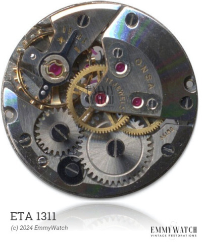 The ETA 1311 is a watch movement that features a larger base plate compared to the AS 1130 movement. The differences between the 1337 and the 1511 variants are not specified. This movement is a manual wind with sub second functionality and was typically used during the approximate period of 1955.
