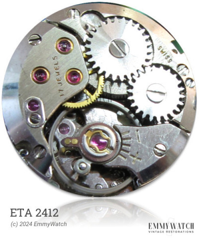 The ETA 2412 is a manual wind mechanical watch movement introduced in 1972. It features a sweep second function and has been in use since its release.