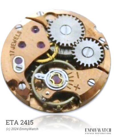 The ETA 2415 is a manual wind watch movement utilized for period timepieces around 1960. It incorporates functions such as sweep seconds and a date feature, which can be set by changing the time to 21:15-24h.
