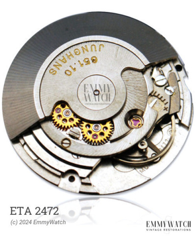 The ETA 2472 is a watch movement introduced in 1962. It features a micro rotor and can have either 21 or 30 jewels, with a double jewel bearing. The movement includes a double excenter regulator for curb pins and stud carrier. It incorporates a selfwinding gear with direction switching facilitated by a pinion floating between two large jewels. The minute and second hands are indirectly driven, allowing for a low profile design. Notably, the hour wheel runs in an oval hole and is pressed by a spring, which is integrated into wheel C for precise bearing and reduced height. Minor modifications to the base plate were made since 1966/67. The movement includes functions such as automatic winding, sweep seconds, and Incabloc shock protection. It has been in use since 1962.