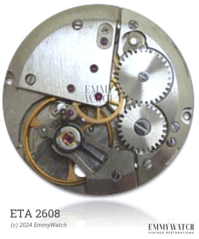 The ETA 2608 watch movement is a manual-wind chronograph movement with a 60-second, 30/45-minute capability, and an operational pillar wheel. The movement also features a sub-second function, a chronograph, and a calendar. The 381 and 383 variations of this movement primarily differ in their pillar plate sizes. This movement was employed in watches manufactured starting from 1932.