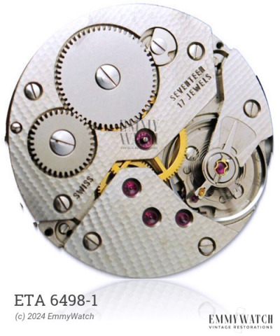 The ETA 6498-1 is a manual wind mechanical watch movement. It features a sweep second function and an adjustable Stud Holder. The movement also includes a sweep seconds hand. It was predominantly used in the period around 1955.