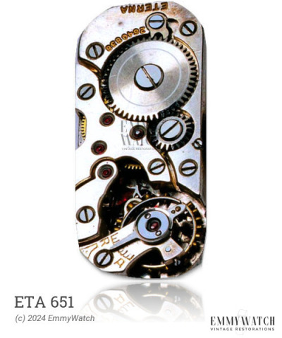 The ETA 651 watch movement, produced in 1903 with a total of 6000 units, belongs to the hunter calibre, model 2. It features a bimetallic screw balance and a Breguet hairspring. The movement incorporates a negative stem mechanism and offers stem winding and setting functionality. Additionally, it includes a sub-second function. The ETA 651 movement was typically utilized in watches manufactured around 1911.