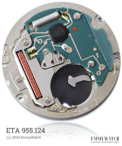 The ETA 955.124 watch movement, used during the period of 1975-1976, features a variety of functions including a quartz controlled stepper motor, sweep second, and date function with quickset capability. This movement is classified as electronic and utilizes quartz technology. The watch's hour and date settings are adjusted with a pulled crown, while the minute setting is controlled by a pusher located within the crown.