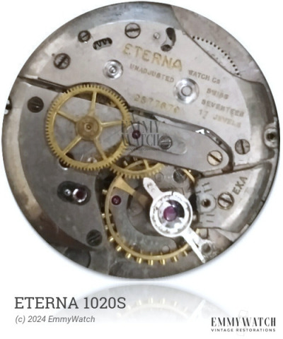The Eterna 1020S is a manual-wind chronograph movement that features a pillar wheel system for its 60s, 30min, and 12h chronograph functions. It also includes a sub second hand and a date hand positioned at 12h. The moon phase complication can be set using a pusher located at 10h. Additionally, the movement incorporates calendar functionality. The Eterna 1020S movement was predominantly used during the approximate period of 1950.