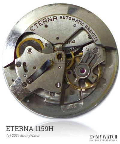 The Eterna 1159H watch movement is a detached manual wind movement with a micrometer regulator. It belongs to the family of 470, 490, and 500 movements and was produced in a total quantity of 1,075,000. It features automatic winding, a sweep second hand, and Incabloc shock protection. The Eterna 1159H movement was used during the period of 1954-1959.