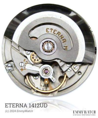 The Eterna 1412UD is a detached manual wind watch movement that was used during the period of 1958-1961. It features automatic winding and a sweep second function.