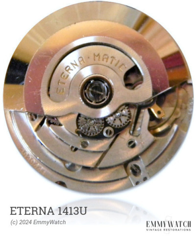 The Eterna 1413U watch movement is an automatic movement with a sweep second function. It includes a date function, which can be set by changing the time to 20:30-24h. This movement was commonly used during the approximate period of 1965.