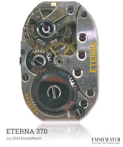 The Eterna 370 watch movement is an open face calibre with a Breguet hairspring. It belongs to a series of movements which include the 331 and 333, with differences unknown. The movement features stem wind and set functionality, along with a sub second function. It was primarily used during the period around 1930.