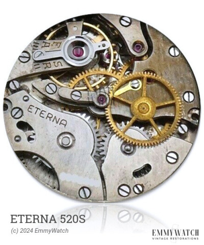 The Eterna 520S is a mechanical watch movement with manual winding capabilities and a date function. It was commonly used during the period of approximately 1950.
