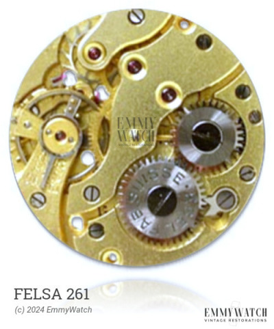 The Felsa 261 is a manual wind watch movement that features a sweep second function. It is equipped with an adjustable stud holder and utilizes Incabloc shock protection. This movement was commonly used in watches during the time period of approximately 1970.