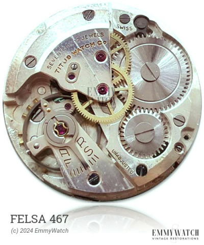 The Felsa 467 is an open face calibre mechanical watch movement, which was likely produced in the mid-1940s. It features a stem wind and set function, along with a sub second hand. It may have an optional Breguet hairspring and potentially include a left-handed ratchet-wheel screw. Several variations of the movement exist, denoted by catalog designations such as 233, 237, 241, 247, 253, 257, 263, 269, 275, 281, 443, 453, 475, and 481, with varying bridge shapes. Precise differences between these versions are not currently known.