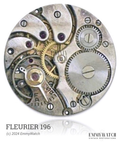 The Fleurier 196 watch movement features a train bridge that covers the first digits of its serial number. It is equipped with manual wind functionality and includes a sweep second hand.