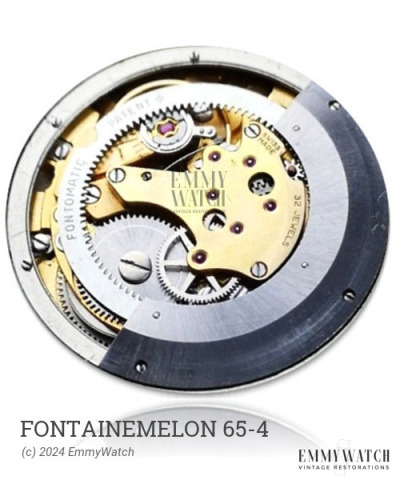 The Fontainemelon 65-4 watch movement features a bimetallic screw balance and is based on the Venus 60-II base movement. It incorporates a special barrel with Geneva stopwork. Although a fitting Glycine calibre was available, the decision to use the Venus 60-II as a base movement is interesting, possibly due to the existence of an 8.75''' caliber where manual winding remains possible without removing the crown wheel. This movement is an automatic (bumper) movement with no manual wind capability and includes a sub second function. It was commonly used around 1930.