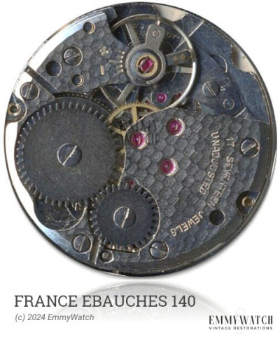 The France Ebauches 140 is a mechanical watch movement with a pin-lever escapement and a two-layer base plate. The use of bushings for almost all bearings allows for variants with more jewels. An ingenious design feature entails the use of one simple part to replace the setting-lever spring, yoke, and yoke spring. It is worth noting that the France Ebauches 140 is equivalent to the Muller-Schlenker 17a and Parrenin 66 movements, with the production likely being passed from Parrenin to Muller-Schlenker. This movement offers manual wind functionality, a sub-second display, and was typically utilized during the period of approximately 1970.