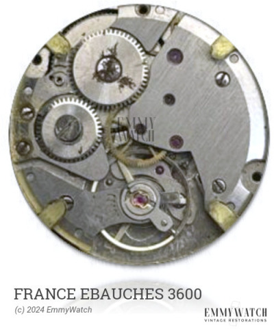 The France Ebauches 3600 watch movement is a manual wind movement featuring a sub second function, a date function, and a calendar function. It was commonly used in watches around the 1950s.