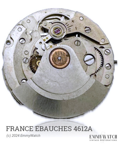 The France Ebauches 4612A watch movement is an automatic movement with a sweep second function. It shares similarities with the ETA 2520 movement, but it incorporates Kif shock protection and features a different rotor shape. Additionally, it possesses an anodized alumina barrel that ensures lifetime lubrication. Although the exact differences between the France Ebauches 4612A and 623 movements are not known, it is speculated that the designators were simply changed in 1966. Samples of watches with both movement numbers have been observed from that year. The France Ebauches 4612A movement was utilized around the period of 1966.