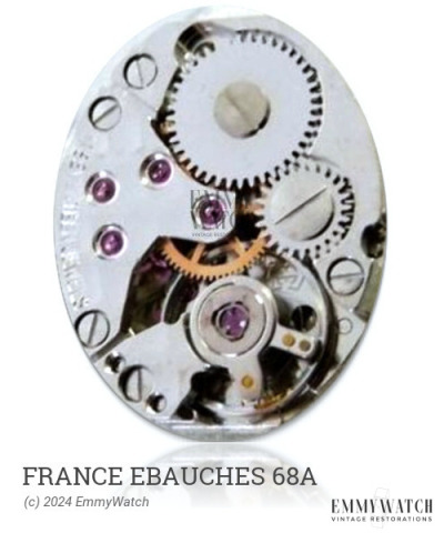 The France Ebauches 68A is a mechanical watch movement that was in use from 1956 to 1963. It is a manual wind movement with a sweep second hand and a date function that can be set by +/- 24 hours.
