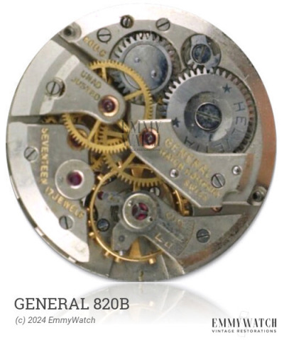 The General 820B is a manual wind mechanical watch movement that features a sub-second function. Its specific differences from the 2325-2330 and 2335-2339 movements are not widely known, but it is speculated that they may involve variations in bridge designs. The General 820B movement was commonly utilized in watches produced around the 1950s.