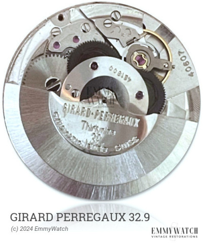The Girard Perregaux 32.9 watch movement is a detached manual wind movement that was used during the period of 1960-1965. It is equipped with automatic winding and features a sweep seconds function.