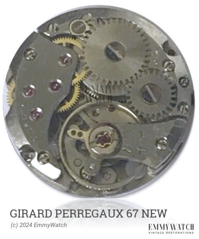 The Girard Perregaux 67 NEW watch movement is a manual wind, sub second movement that was manufactured in the United States during 1938-1939. It was produced in a quantity of 89,000 units and is equipped with a Breguet hairspring.
