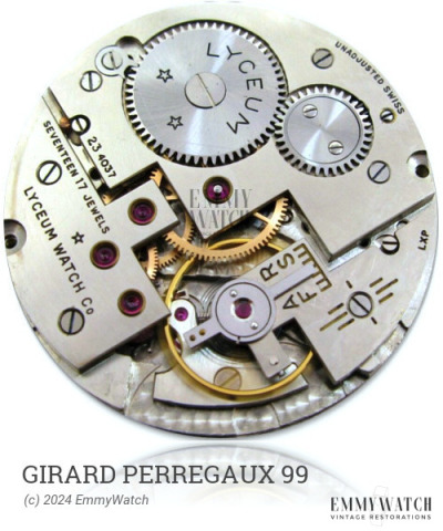 The Girard Perregaux 99 watch movement features a bridge layout that differs from the common AS 1525 movement. The differences between the 25.09, 25.19, and 25.29 movements are not known. The movement is manually wound and includes a sub-second function. It was produced around the period of 1960.