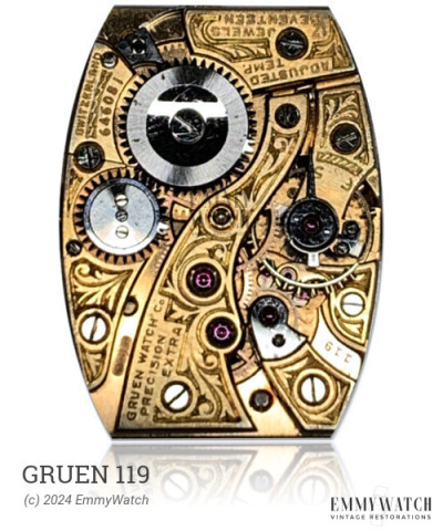 The Gruen 119 watch movement was produced from 1897 to 1913, with a total of 10,000 units manufactured. It features a hunter calibre with model 2 specifications. The movement includes a bimetallic screw balance, Breguet hairspring, and a pink-gold center wheel. It also incorporates a negative stem mechanism with an additional lever, enabling switchable winding and setting functionality with the crown. Other functions of the movement include stem winding and setting, as well as a sub second display.