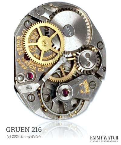 The Gruen 216 watch movement features a pin lever escapement and a ratchet on the dial side. The crown mechanism is equipped with a rocker bar. It offers the options of having or not having a sub second function, as well as a digital display for hours, minutes, and seconds. Additionally, the movement allows for manual winding.
