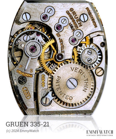 The Gruen 335-21 watch movement is a manual wind movement with a sweep second function. It features an Adjustable Stud Holder and Shock Protection mechanisms. The movement also includes an additional function of sweep seconds. It was commonly used in watches around the year 1974.