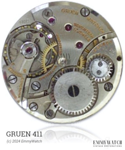 The Gruen 411 watch movement, used during the period 1975-1977, features a balance with three spokes instead of two and a larger plate recess for the lever cock. The transition period resulted in a mix of old and new components, leading to some inaccuracies in the signatures. This manual wind movement includes functions such as a sweep second hand.