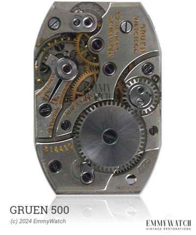 The Gruen 500 is a hunter caliber watch movement that features stem winding and setting functionality. It incorporates a sub-second function as well. The movement can be equipped with an optional Breguet hairspring and exhibits varying bridge shapes. The possible existence of a left-handed ratchet-wheel screw in the movement is suggested, although not confirmed. It should be noted that the exact differences between the Unitas 34 and 384 movements are not specified, and these designations are likely catalog identifiers referring to the varying bridge shapes.