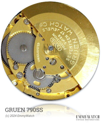 The Gruen 790SS watch movement is an automatic movement with sweep seconds and a calendar with quickset functions. It is part of a series that includes the 2630 and 2638R, but the differences between these models are not known. The movement has been used since 1970.