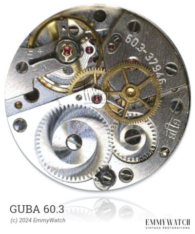 The Guba 60.3 watch movement is a manual wind, sub second, mechanical movement that was in use around 1966.