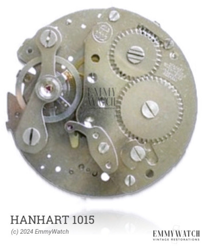 The Hanhart 1015 is a manual wind watch movement with a period of use around 1965. It features an indirect minute hand friction clutch on the barrel, which allows for a large barrel and a large balance.
