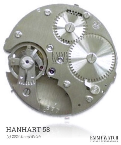The Hanhart 58 watch movement is a hunter calibre with a Breguet hairspring. The specific differences between the 584 and 586 movements are not known. It features stem winding and setting, as well as a sub-second function. The 586 movement was commonly used around the year 1955.