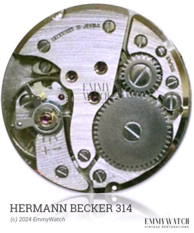 The Hermann Becker 314 is a mechanical watch movement with manual winding and a sub-second function. It was produced around 1925, and it belongs to a series of movements including the 361-367, 500, 501, and 505-509. The specific differences between these movements are not known.