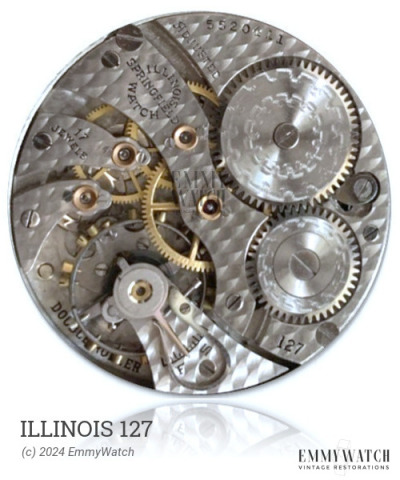 The Illinois 127 watch movement is a manual wind movement commonly signed as AS 970, with variations including the option for an optional bimetallic screw balance and without a separate escape-wheel cock. It belongs to a family of movements that share similarities in calibre designations and can have interchangeable parts. Notable functions include manual winding and sweep seconds. This movement was commonly used around 1940.