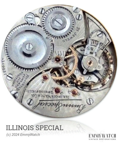 The Illinois SPECIAL is a manual wind movement that features a pin-lever escapement and a flying barrel. It incorporates an indirect minute hand friction clutch on the barrel and introduces an innovative design with a single part that replaces the setting-lever spring, yoke, and yoke spring. This movement also includes a sweep second function. The Illinois SPECIAL movement was used around the period of 1970.