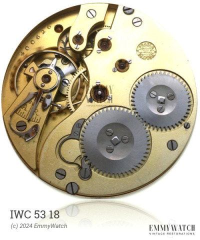 The IWC 53 18 watch movement from the early 1960s features a pin-lever escapement and an indirect minute hand friction clutch on the barrel. It incorporates a single part that replaces the setting-lever spring, yoke, and yoke spring. Some early samples of the movement also come with a pointed staff. The IWC 53 18 movement offers functions such as manual wind, sweep second, and date, among others.