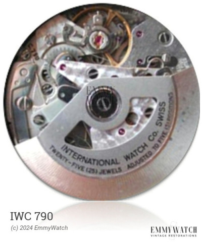The IWC 790 is a mechanical watch movement with an automatic winding system. It features a sweep second hand and a day and date display that can be quickly set. The movement also includes a hack feature, allowing for precise time setting. The IWC 790 was utilized during the period of 1974-1975.