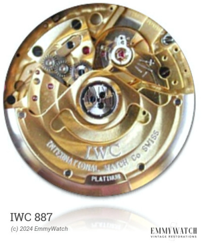 The IWC 887 is a mechanical watch movement from approximately 1975. It features an automatic winding system and sweep second function. The stem mechanism lacks a setting-lever spring, and in later samples, the hairspring terminal is glued. The movement also incorporates separate drives for the train and hand gears, all while utilizing jewel lever technology.