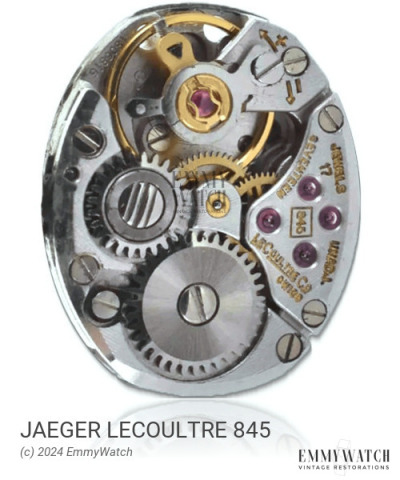 The Jaeger Lecoultre 845 watch movement features a pin-lever escapement and an indirect minute, hand friction clutch on the barrel. It is equipped with a stem mechanism without a setting-lever spring. The movement offers manual winding and sweep seconds functions, with an option to exclude the second hand. The date is set by changing the 22.45-24h position. The movement utilizes a pin lever mechanism and was commonly used around 1980.