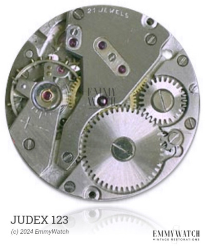 The Judex 123 watch movement is a manual wind movement with a sweep second function. It was introduced around 1955.