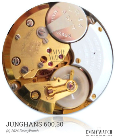 The Junghans 600.30 watch movement, introduced in 1968, features an electronically controlled tuning fork mechanism. It incorporates a sweep second hand and allows for the setting of the day by changing the 18-24 hour time display. The movement also includes a quickset function for easy adjustment of the date. Notably, it incorporates a mechanical hack feature to allow precise time synchronization.