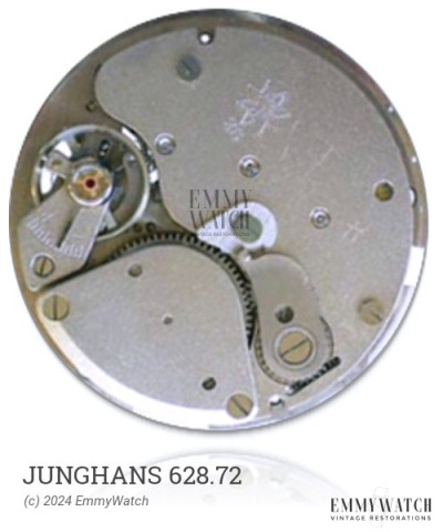 The Junghans 628.72 watch movement, used from 1968 to 1972, is a manual wind movement with an indirectly driven minute function that accommodates a large balance. It includes an Adjustable Stud Holder, Offset Center Wheel, and Incabloc Shock Protection.