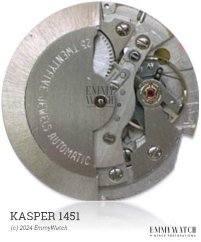 The Kasper 1451 watch movement, introduced in 1976, features a ball-bearing rotor and a sophisticated excenter self-winding mechanism with just one gear stage. It does not have a hairspring stud, as the hairspring is directly clamped in the terminal. The movement shares many parts and casing dimensions with equivalent models of the 61XX family. It is an automatic movement with no manual winding feature. The movement includes functions such as sweep seconds, hours, minutes, and central seconds. It also includes a quickset date feature located at the 3 o'clock position.