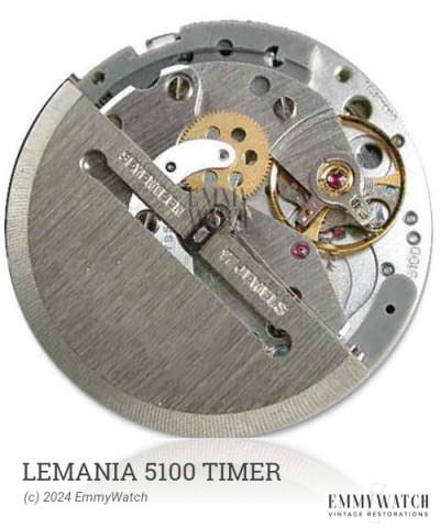 The Lemania 5100 TIMER watch movement is equipped with an alarm function, automatic winding, sweep seconds hand, and a calendar feature.