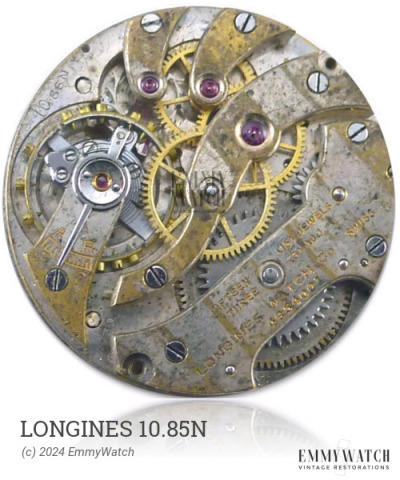 The Longines 10.85N is a manual wind movement with a sub-second function. It shares similarities with other Venus movements such as the 75, 78, 79, 83, 84, 89, 94, 97, 98, 103, 105, 106, 129, and 148, indicating that these may be catalog designations for variations in bridge shapes.