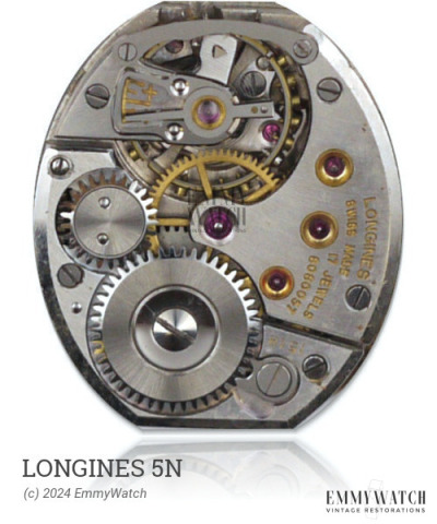 The Longines 5N watch movement, produced from 1935 onwards, features a bimetallic screw balance and a Breguet hairspring. This manual wind movement incorporates a sub second function.